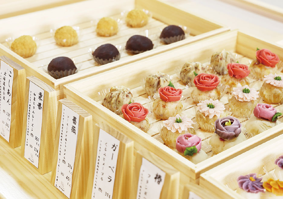 毎朝、手作りで季節の花をモチーフにした華やかなフラワーおはぎが熟練の職人さんの手の中から次々と咲いていきます。賞味期限は当日中。長めのお日持ちを希望される場合は、冷凍でのお渡しが可能(要ご予約)です。